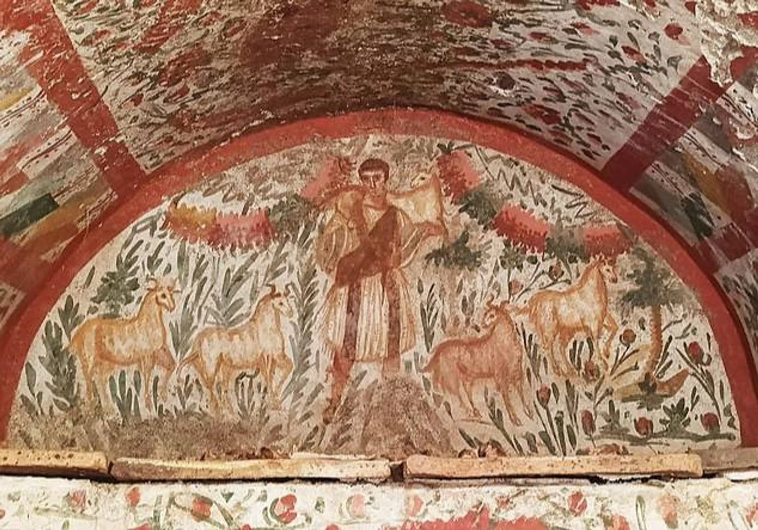 На стіні давньої підземної усипальниці в Туреччині археологи виявили яскраву фреску III століття, на якій зображено Ісуса серед кіз на полі. Він постає у вигляді молодого, безбородого чоловіка в простому одязі, що несе козу на плечі.