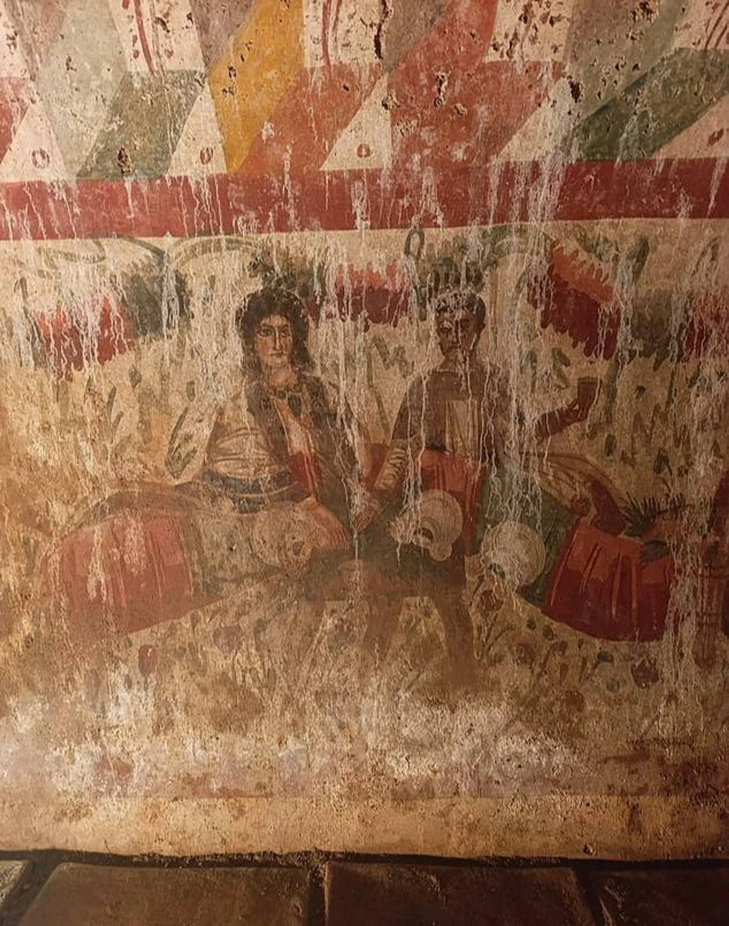 Попри християнський характер гробниці, сусідні сцени зберігають язичницькі мотиви, де загробне життя подається як безкінечне святкування.