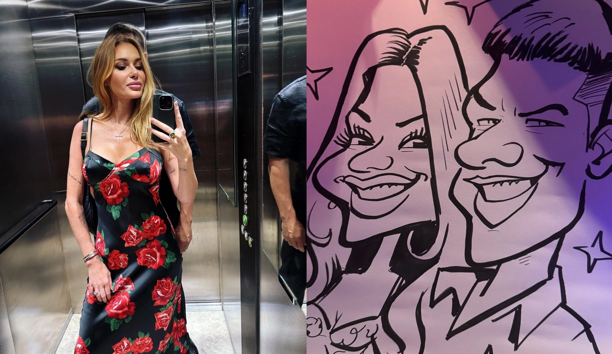 “Неангелка” виклала в мережу світлину з ліфта. Слава вбрана у шикарний чорний сарафан з великими червоними трояндами на тканині. Волосся зірки розпущене, але неукладене. А за спиною ховається незнайомець.