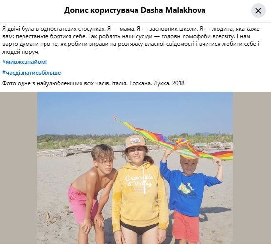 Так, на Facebook-сторінці Малахова у дописі поділилася власним досвідом колишніх стосунків з жінками. Крім того, пороздумувала щодо людської природи, прийняття себе і сексуальності, зокрема в умовах війни.