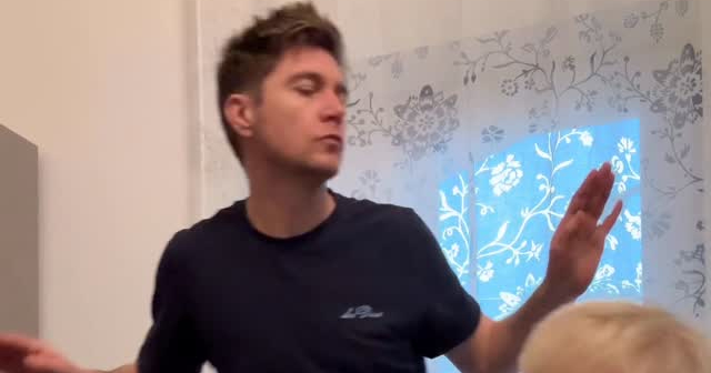 На кадрах Тім сидить за дитячим столиком і весело махає головою, поки його тато показує відточені танцювальні рухи під дитячу пісеньку про курочку.