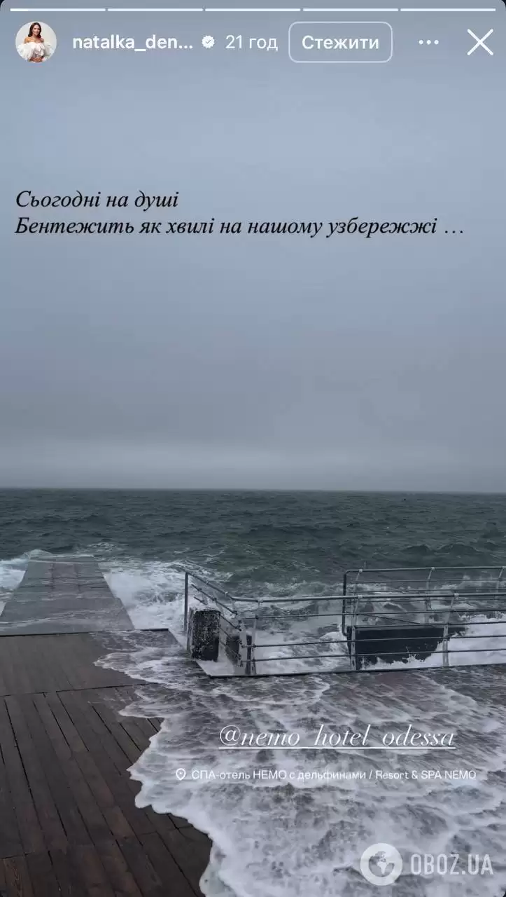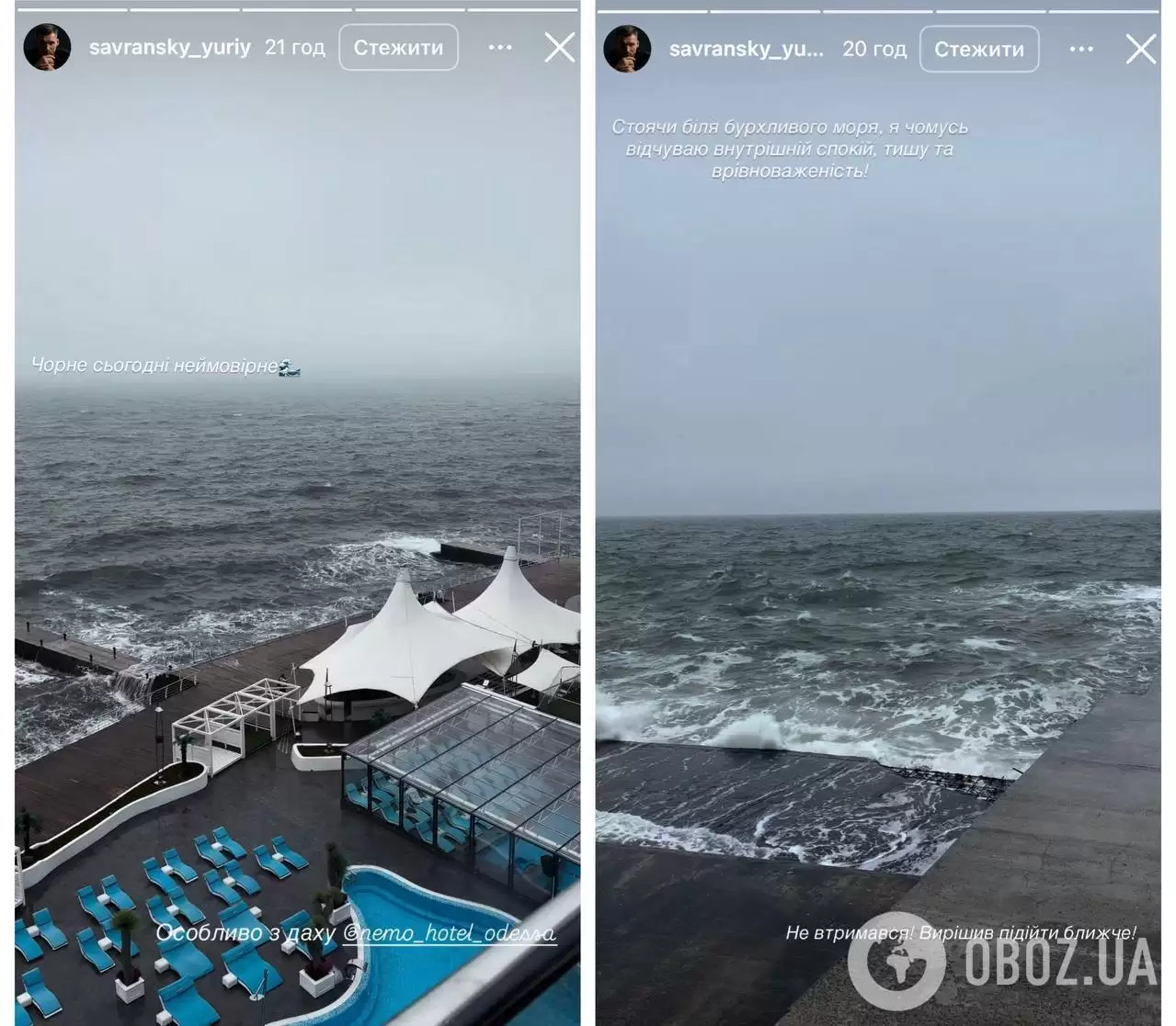 У своїх Instagram-stories артистка оприлюднила кадри із бурхливим Чорним морем та залишила підпис: “Сьогодні на душі бентежить, як хвилі на нашому узбережжі”. Майже в той самий час Савранський опублікував дуже схожу сторис, на якій можна розгледіти той самий пірс, як і в дописі Денисенко.