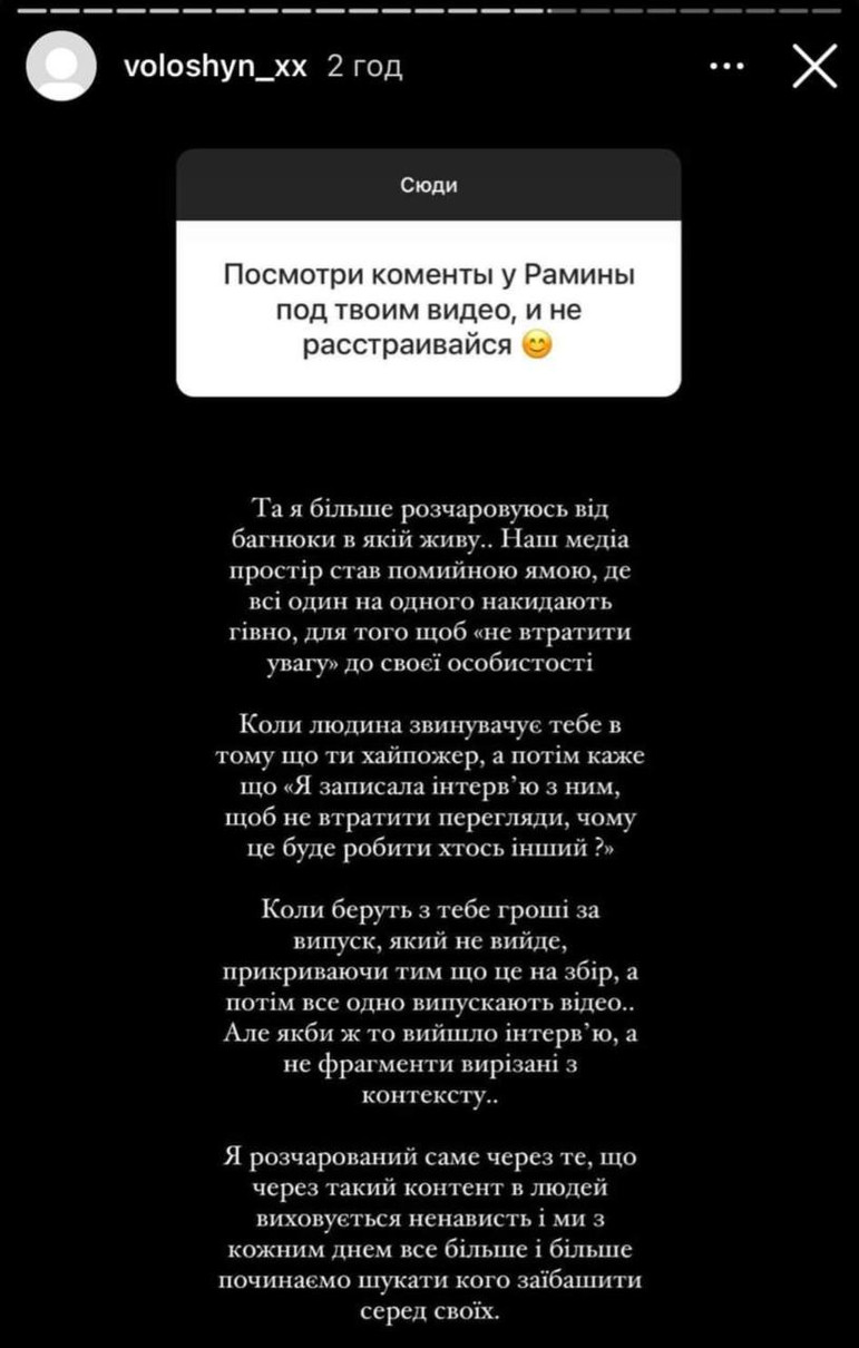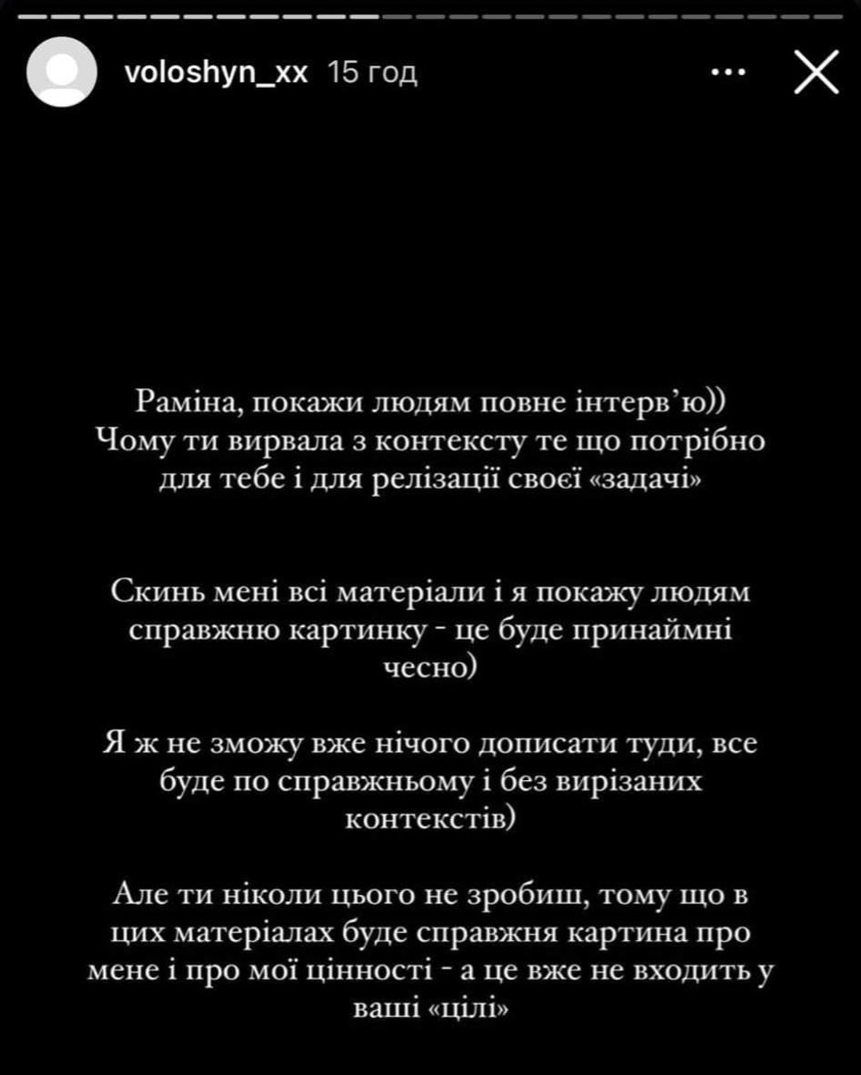 Волошин додав, що Раміна ніколи цього не зробить, адже тоді у матеріалі буде, мовляв, «справжня картина» про нього та його цінності, а це не входить «у ваші цілі».