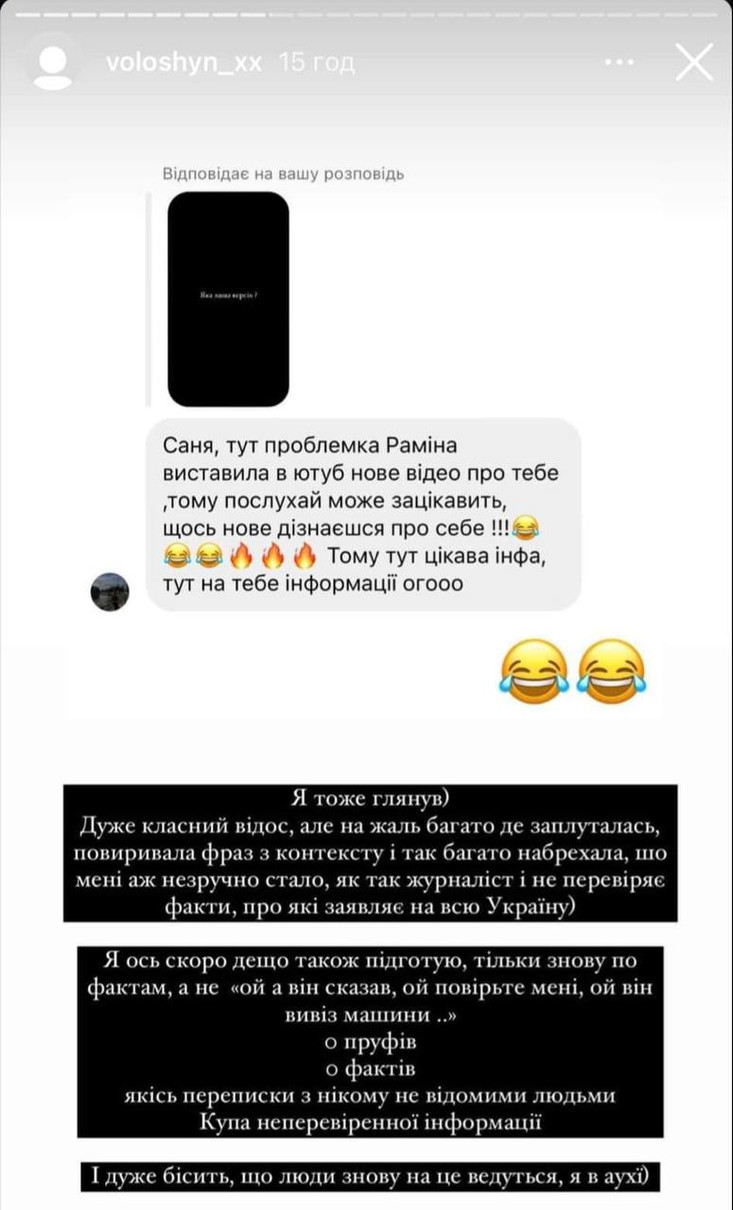 «Мені аж не зручно стало, як так журналіст не перевіряє факти, про які заявляє на всю Україну. Я ось скоро дещо також підготую, тільки знову по фактам, а не «ой, він сказав, ой повірте мені, ой він вивіз машини…». 0 пруфів, 0 фактів. Якісь переписки з нікому невідомими людьми. Купа неперевіреної інформації. І дуже бісить, що люди знову на це ведуться, я в а**ї», — написав Олександр.