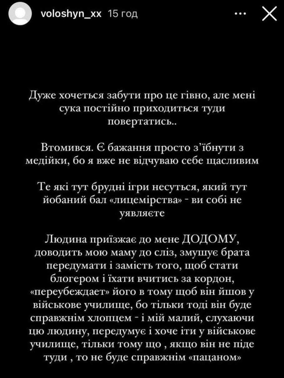 «Є бажання просто з’ї***ти з медійки, бо я вже не почуваю себе щасливим. Те, які тут брудні ігри несуться, який й**аний бал «лицемрства» — ви навіть не уявляєте», — зазначив Волошин.