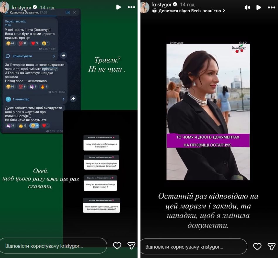 Христина наголосила, що в Instagram прізвище «Остапчук» вказане лише через юридичні нюанси: вона є нотаріусом, і за офіційним прізвищем у пошуку в мережі можна знайти її адресу та контакти.