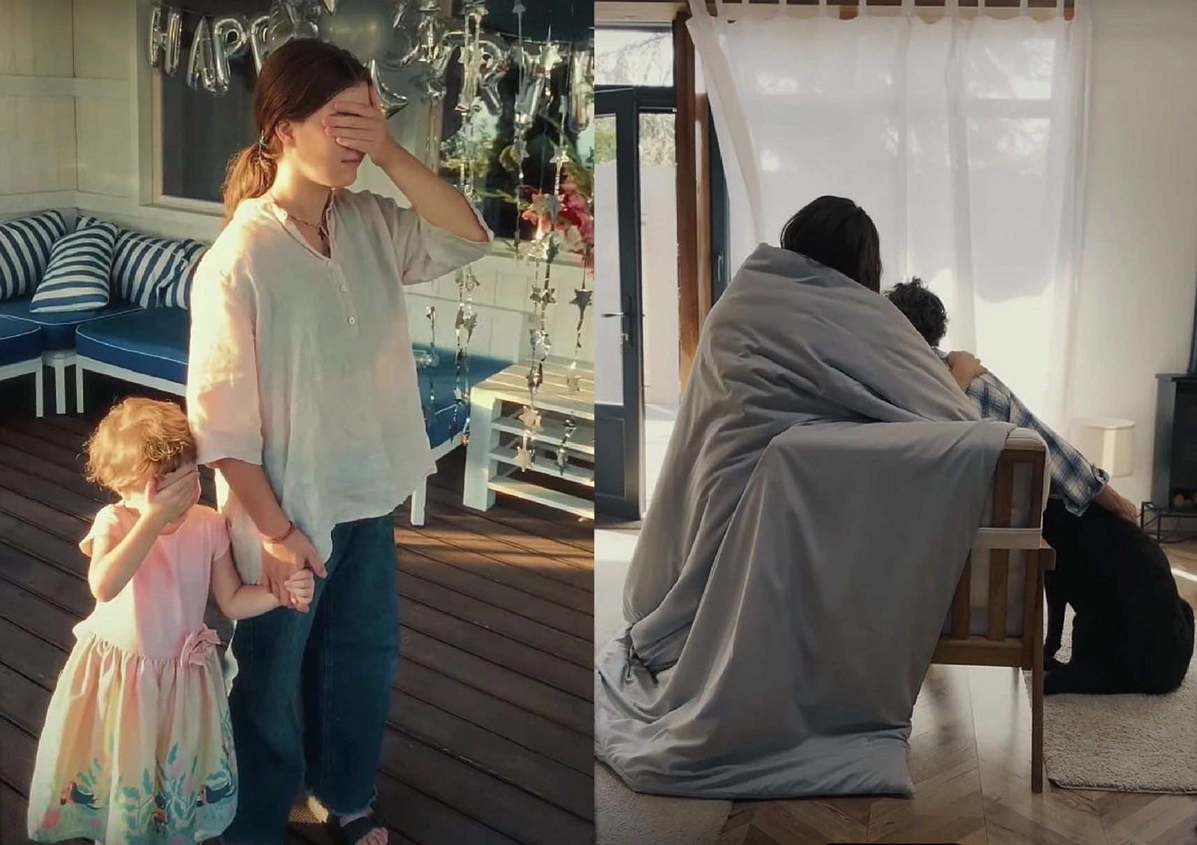 Далі Наталія співає, ніжачись у ліжку, прикрашеному срібними кульками та словесним привітанням. Потім закутується у ковдру й гасає будинком. Донечки ведуть маму на 1 поверх вниз сходами. А ще дарують іменинниці тортик зі свічкою.