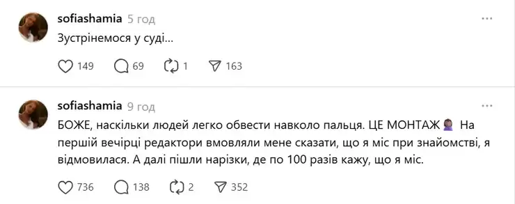 “БОЖЕ, наскільки людей легко обвести навколо пальця. ЦЕ МОНТАЖ. На першій вечірці редактори вмовляли мене сказати, що я міс при знайомстві, я відмовилася. А далі пішли нарізки, де по 100 разів кажу, що я міс”, — пише Софія.